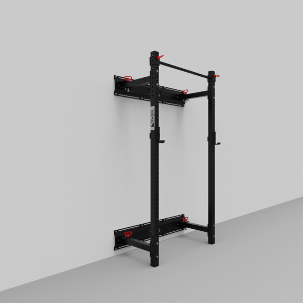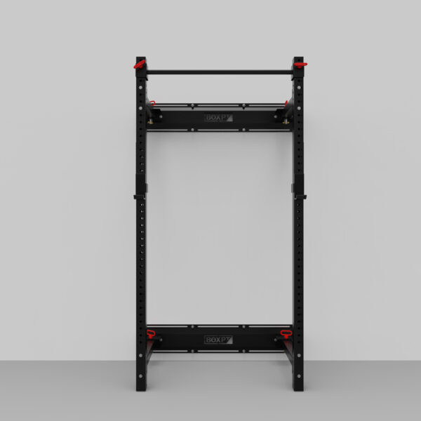 Fully compatible with all the rig’s accessories, this rack will allow you to do everything you do on a normal structure: supporting the Olympic bar, gymnastic movements and mobility exercises. When you’re not training, remove the pull-up bar and fold the rack posts against the wall to save space.